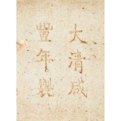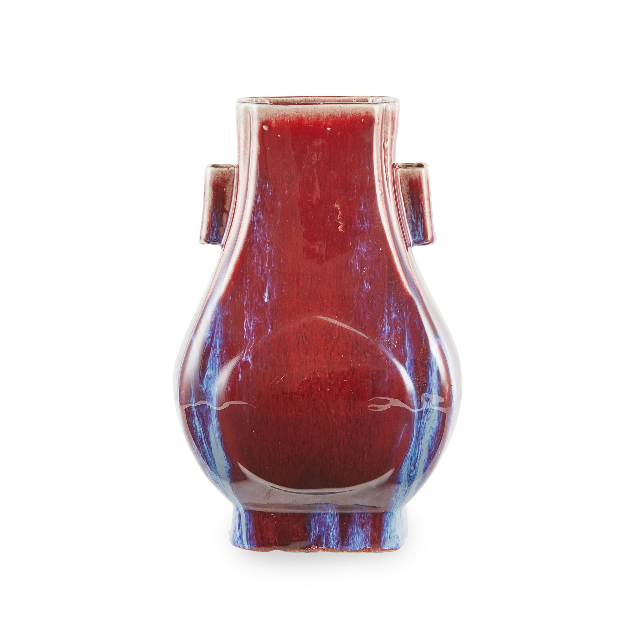 of archaic fanghu form, the body moulded to each side with a peach-shaped cartouche, covered overall with an unctuous glaze of dark red tone streaked with blue and cream on the edges, the buff base carved with a six-character Xianfeng mark