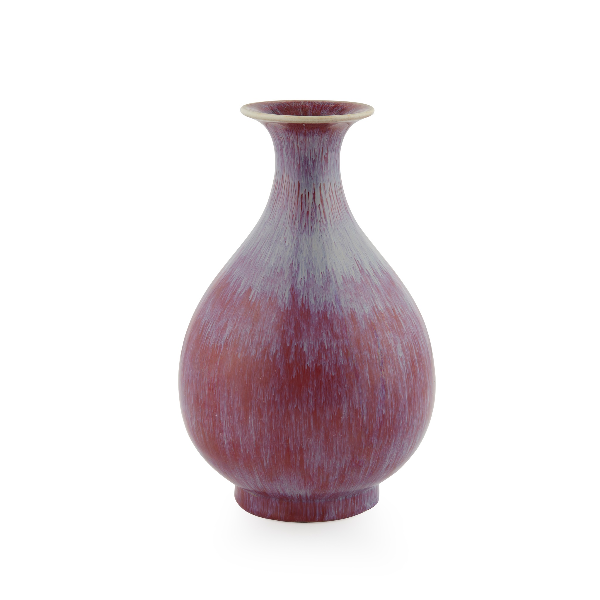 covered overall with a thick purple glaze infused with red and lavender streaks, thinning to a finely crackled creamy colour around the mouth rim