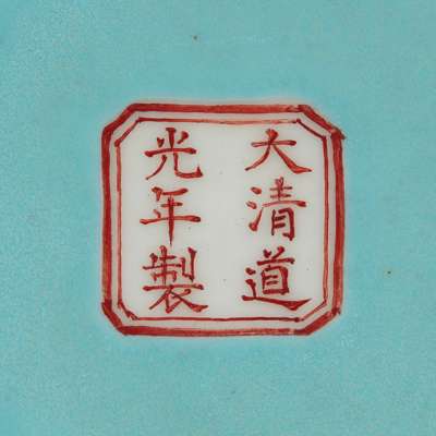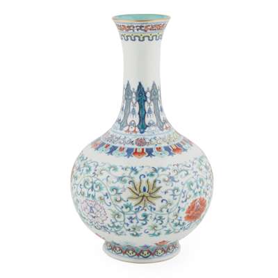 finely decorated on the bulbous body with lotus flowers borne on foliated slender tendrils, the neck with a band of shaped plantain leaves, all decorations outlined in underglaze blue and enhanced with enamels, the base inscribed with a six-character Daoguang mark in iron-red within a square canted-corner panel