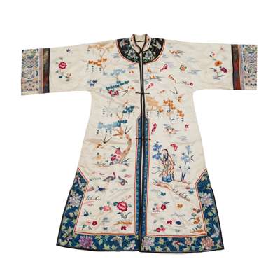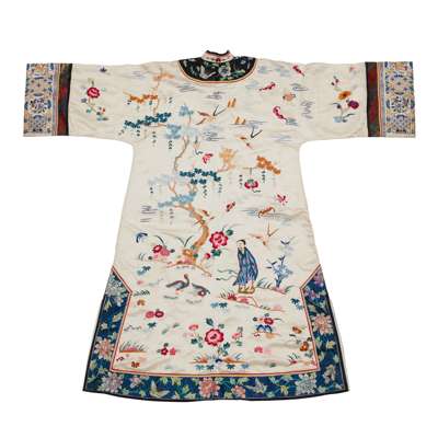 with wide quarter-sleeves, embroidered on both sides of the cream coloured silk ground with a figure underneath a tree canopy bearing pomegranate and peaches, the surrounding with a pair of ducks, magpies, butterflies, bats and flower sprays
