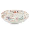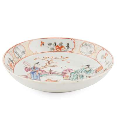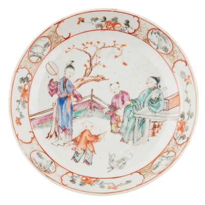 thinly potted, painted in the central medallion with two adults and two children at play in an outdoor setting within a band with floral cartouches