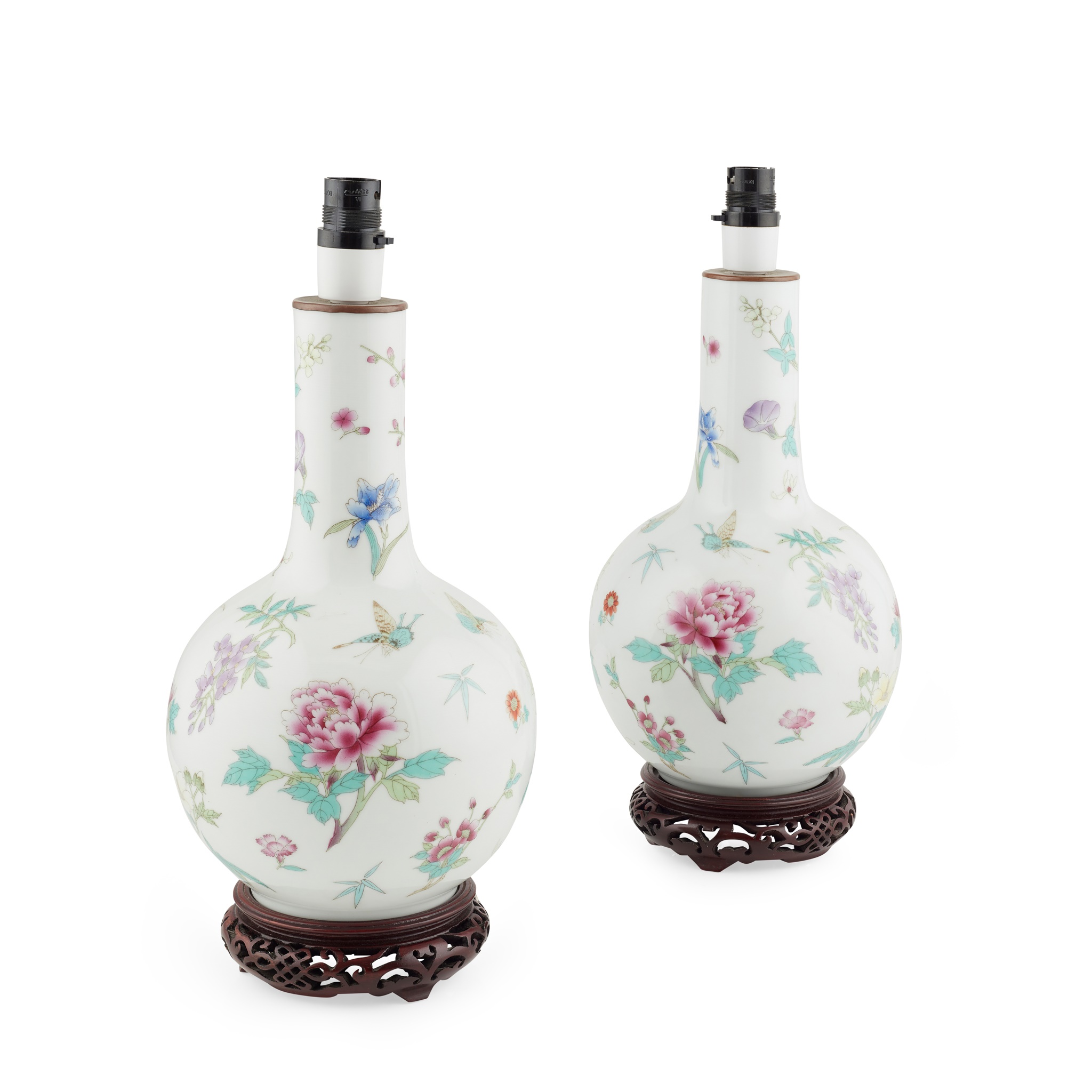 each finely painted with various floral sprays visited by butterflies and dragonflies, mounted on a wooden stand and fitted for electricity