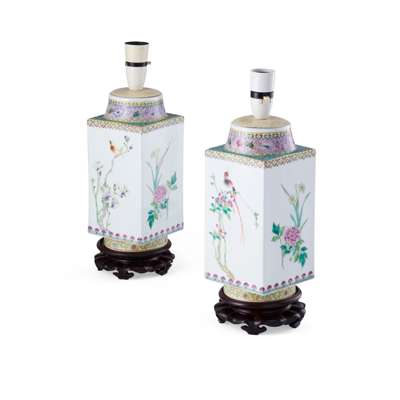 PAIR OF FAMILLE ROSE SQUARE-SECTION VASES