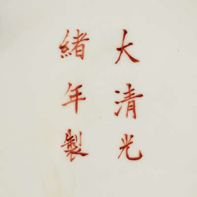 comprising: a plate decorated with bare trees in a shanshui landscape, the cavetto with a band of bats and shou; the other plate decorated with a shanshui landscape underneath a band of stylised lotuses, each base inscribed with a six-character Guangxu mark in iron-red