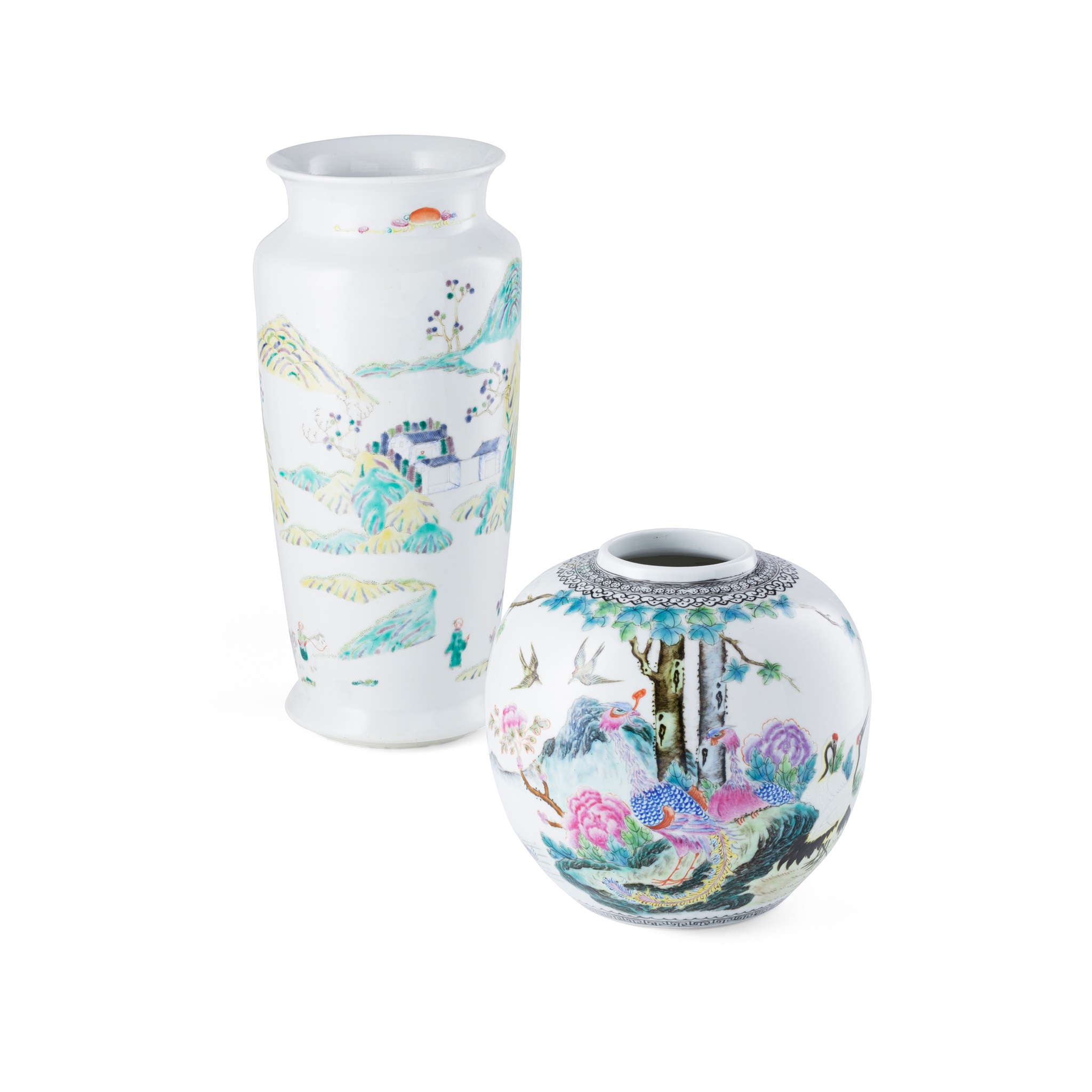 painted around the body with shanshui landscape and figures featured with pastel yellow and green palates, the base with an apocryphal Kangxi mark; and A FAMILLE ROSE GINGER JAR, decorated on the bulbous body with five pairs of animals representing the five cardinal relationships, the reverse with a corresponding inscription, the base with an apocryphal Qianlong mark