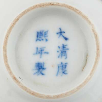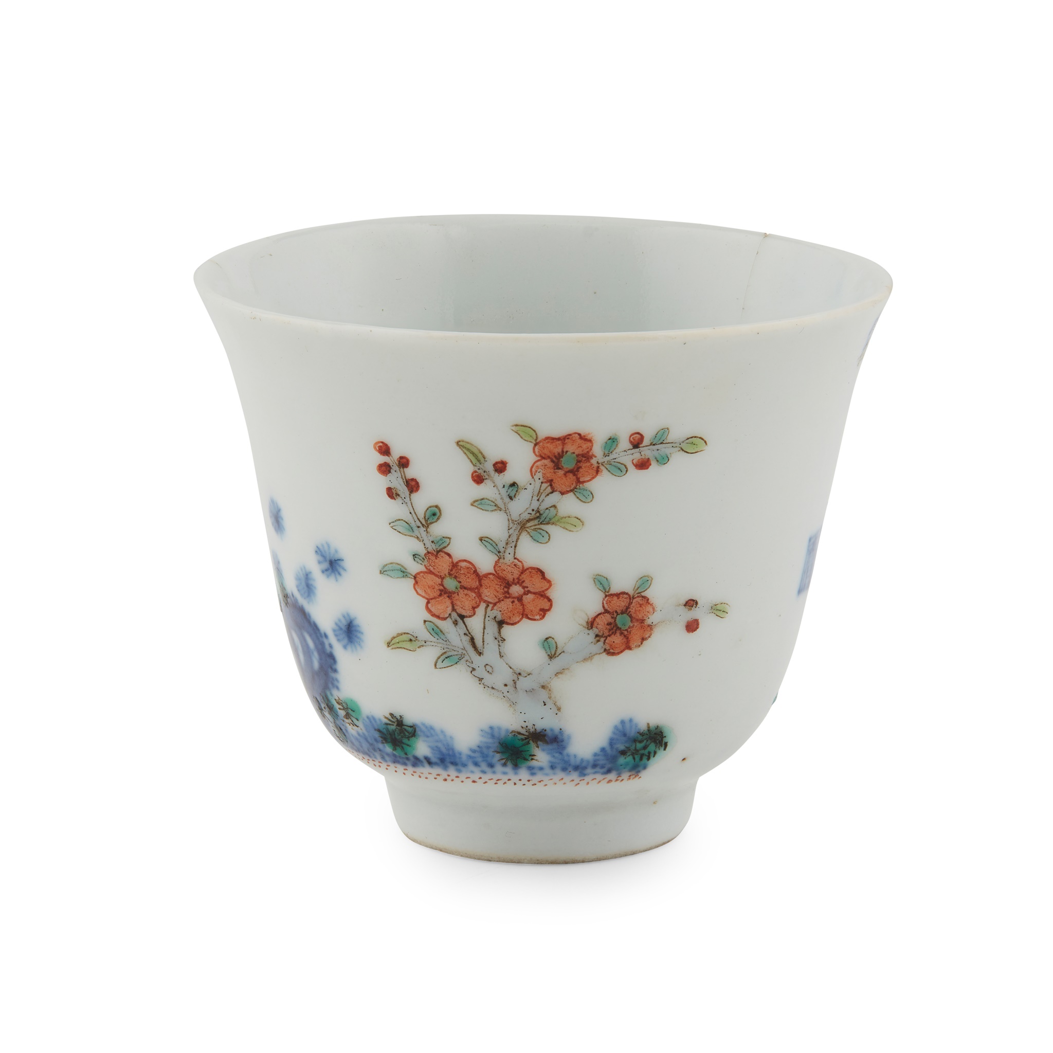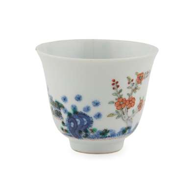 finely potted with rounded and steep sides rising from a short foot to a flared rim, the exterior painted with Prunus representing the second month of the year, the reverse with a correspondent poem