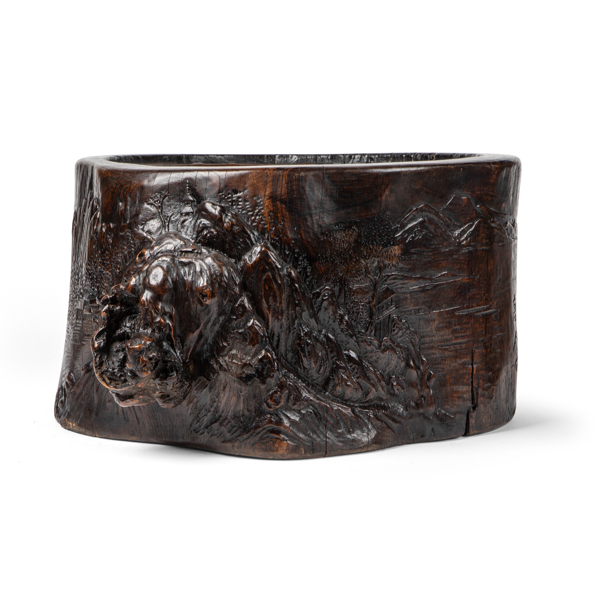 the exterior carved in low relief with natural landscape, including a river divided by a hill cleverly worked on a gnarled section of the material issuing out in high relief, carved and incised to the other side with poem and signed, the inscription dated to March, 19th year of Meiji corresponding to 1886, the interior lined with a copper container