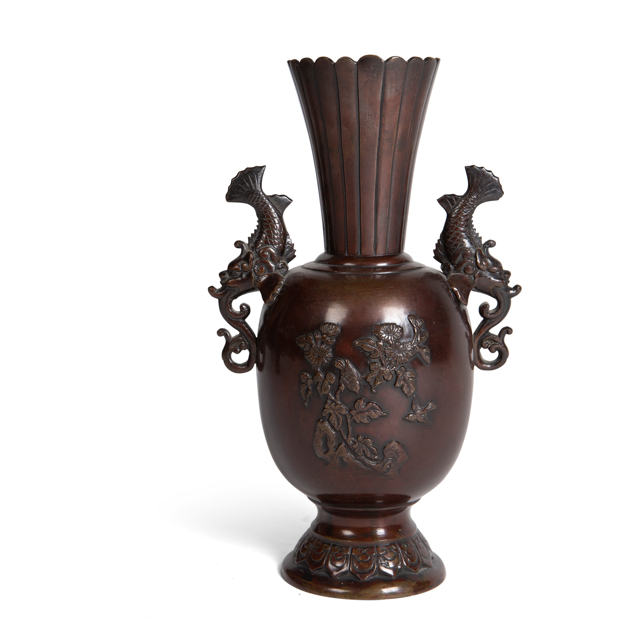 with elongated tapering petal form neck and mouth, the bulbous body decorated with birds and chrysanthemum, flanked by a pair of elaborate mythical fish handles