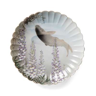moulded with chrysanthemum petal-mouth, the interior finely painted with a koi-fish before sprigs of flower sprays, the base signed with a three-character maker's mark