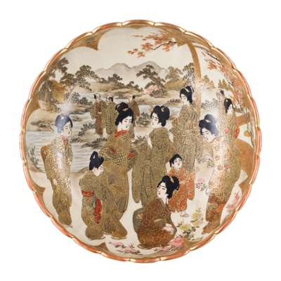 comprising: a notched-rim plate, enamelled and gilded with cranes in a bamboo groove with flowering peonies; together with a lobbed deep bowl, decorated to the interior and exterior with figures, the base signed 'Hododa'
