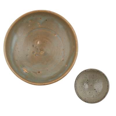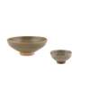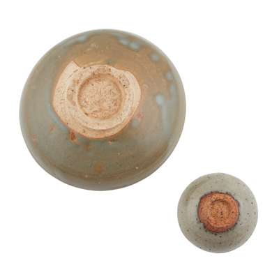 comprising: a bowl, of conical shape with straight mouth, covered with a thick brownish blue glaze stopping irregularly above the foot; and a small conical teacup with greyish glaze
