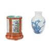 one blue and white baluster vase, painted with flowering prunus issuing from the foot, the base inscribed with a six-character 'Yuan Wen Wu Guo Zhi Zhai' mark in underglaze blue; and a coral-red-ground famille rose quatrefoil brush pot, the base inscribed with a six-character Qianlong mark in iron-red