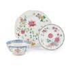 comprising: a famille rose-decorated underglaze-blue large bowl; an octagonal notched-rim charger; and a foliated plate, all decorated with floral and foliage