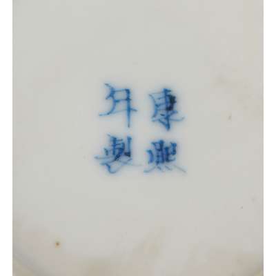 comprising: a pair of meiping-shaped vases, each painted with narrative figures on the body, the base inscribed with a four-character Kangxi mark; together with a ginger jar and a lidded vase, both decorated overall with 'cracked-ice and prunus' motif