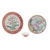 清 外銷粉彩歐洲主題碟、綠彩花卉紋盤 及 礬紅穿花鳳凰紋杯蓋(一組三件)
