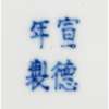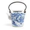 one side painted with a farmer crossing bridge, fisherman catching fish along the river and a water buffalo swimming nearby, all scenes in a mountainous landscape setting with small houses in between and extending to the other side, the recessed cover similarly decorated with a small house in landscape, attached with a metal handle, the base inscribed with a four-character apocryphal Xuande mark