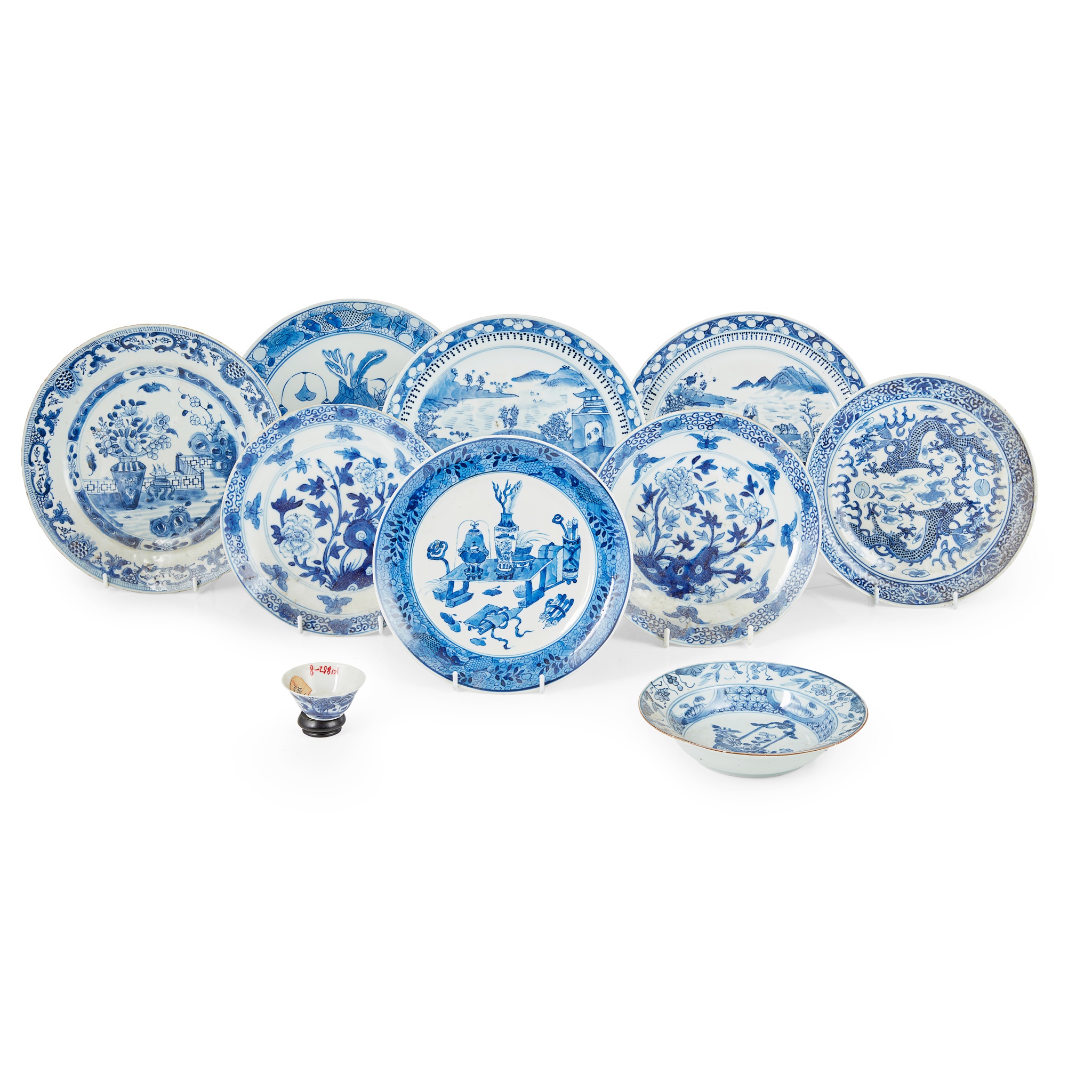 清 各色青花盤、碟 及 若深款 小杯帶木座(共十件)