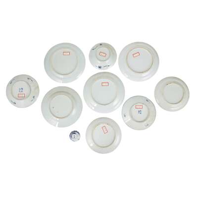 comprising: four plates, of which two as near pair; five dishes, of which two as a pair, each base inscribed with a four-character 'Liu Xie Yuan Ji' mark; and a small thinly potted cup, the base inscribed with a two-character 'Ruo Shen' mark, on a wooden stand