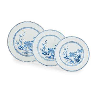 GROUP OF THREE GRADUATED BLUE AND WHITE CHARGERS