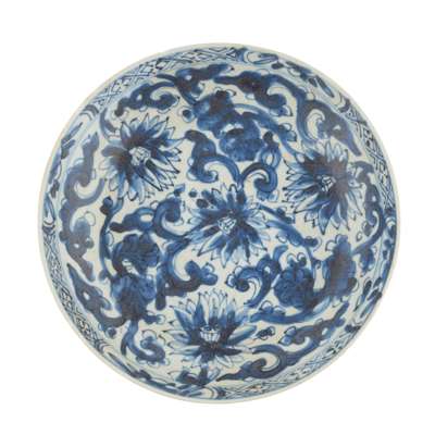 raised from a short foot to wide body, the interior freely painted with scrolling lotus, three flower sprigs decorated the outer cavetto, the base with a leaf mark within a double circle