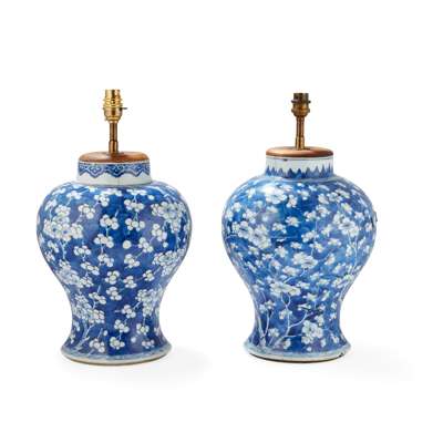 each of baluster form, painted to the body with flowering prunus branches on 'cracked-ice' ground, the base with a double-circle, later converted to electricity
