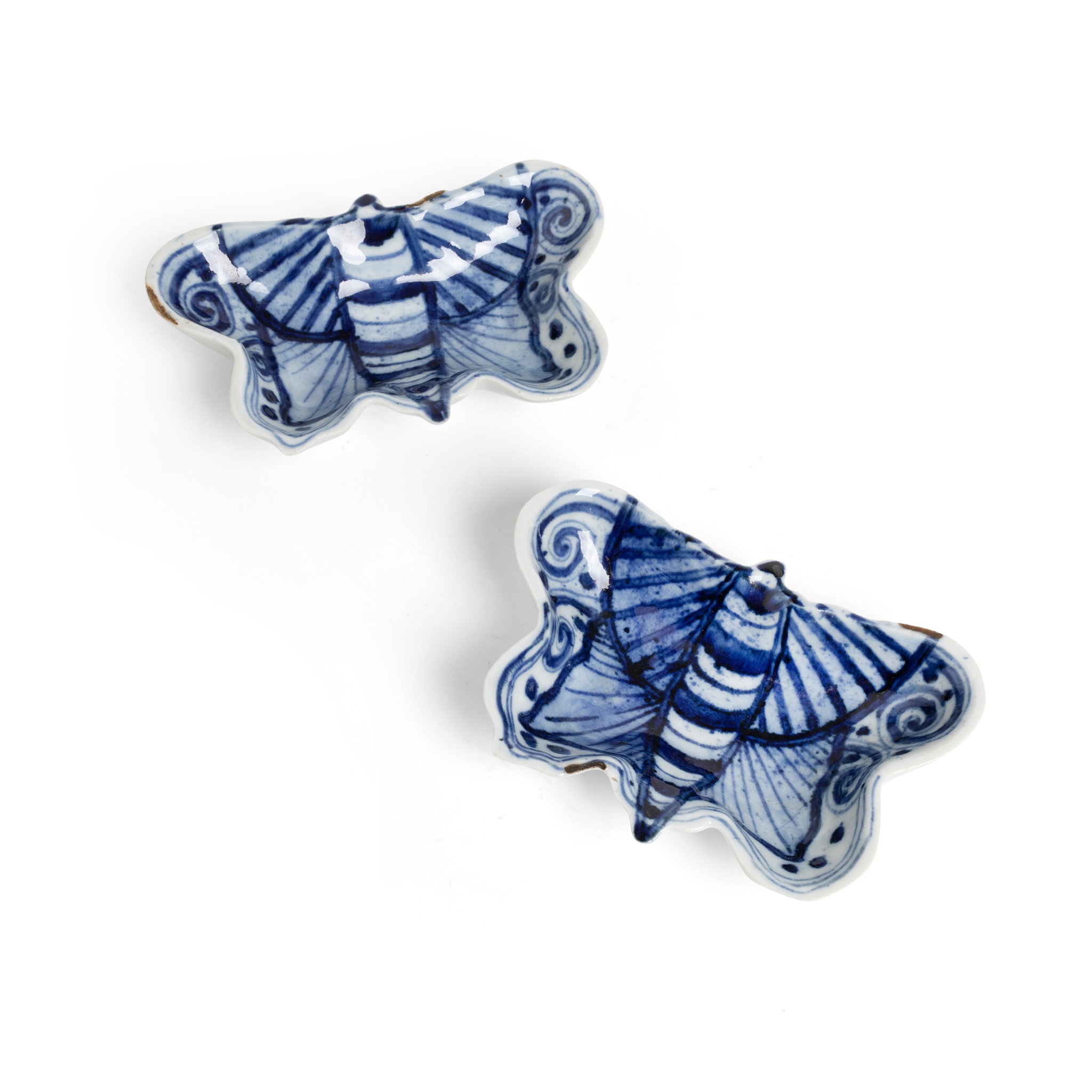 each vessel moulded in the shape of a butterfly with undulating sides, further detailed in underglaze blue to the interior with the elaborate wings and body, the base with five unglazed circular points