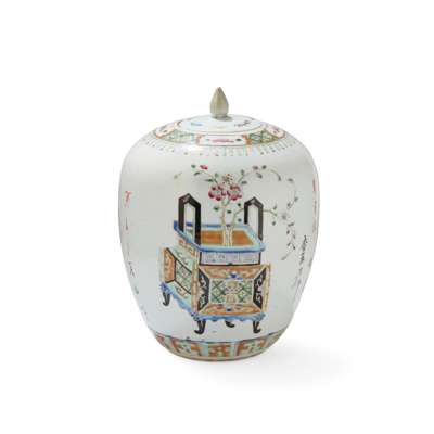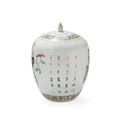 of ovoid form, enamelled on both sides with archaic-form vases issued with flowers, intermittent by inscriptions in two fonts
