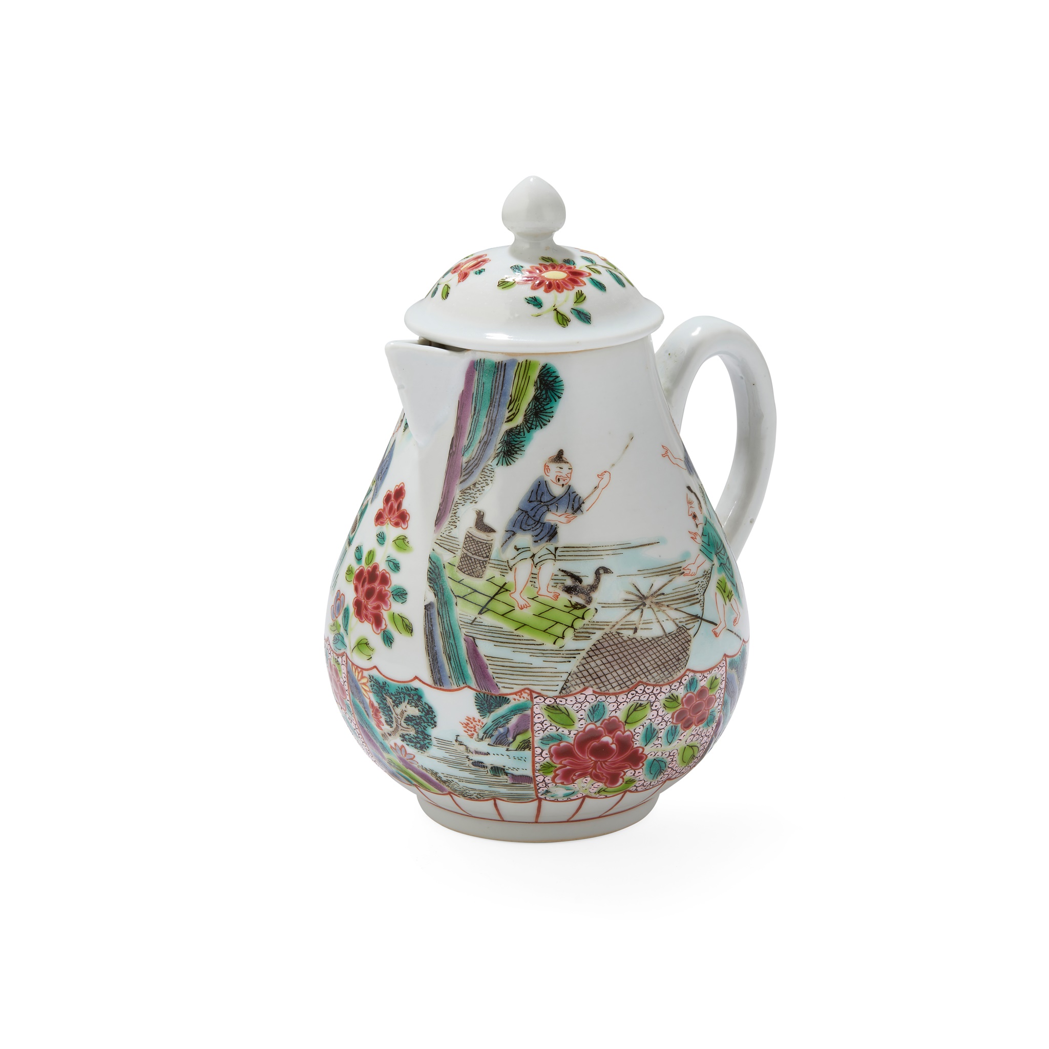 thinly potted, both sides of the body painted in mirrored image with fishermen, above a band of fan-shaped panels enamelled with flowers and shanshui landscape