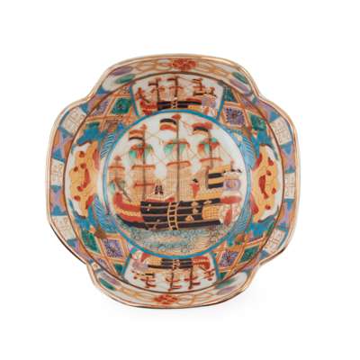 清 乾隆款 伊萬里燒黑船紋花口碗