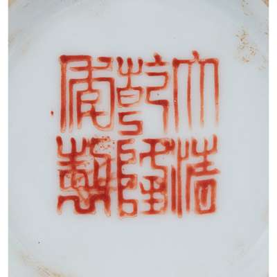 the bulbous body raised from a short foot to a gilded lobed rim, the exterior and interior heavily enamelled with Dutch sailing vessels in cartouches, European noblemen surrounded by trellis ground filled with flowers, the base inscribed with an iron-red six-character Qianlong mark