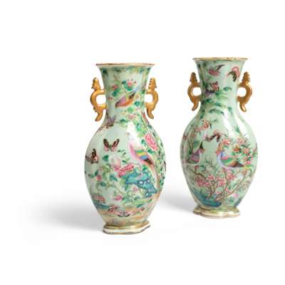 LARGE PAIR OF FAMILLE ROSE CELADON GROUND VASES
