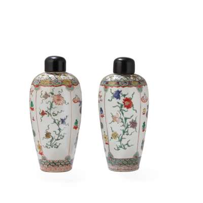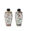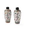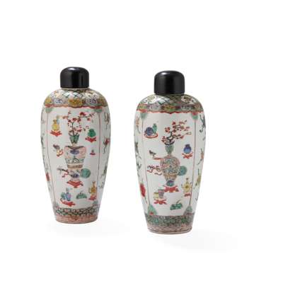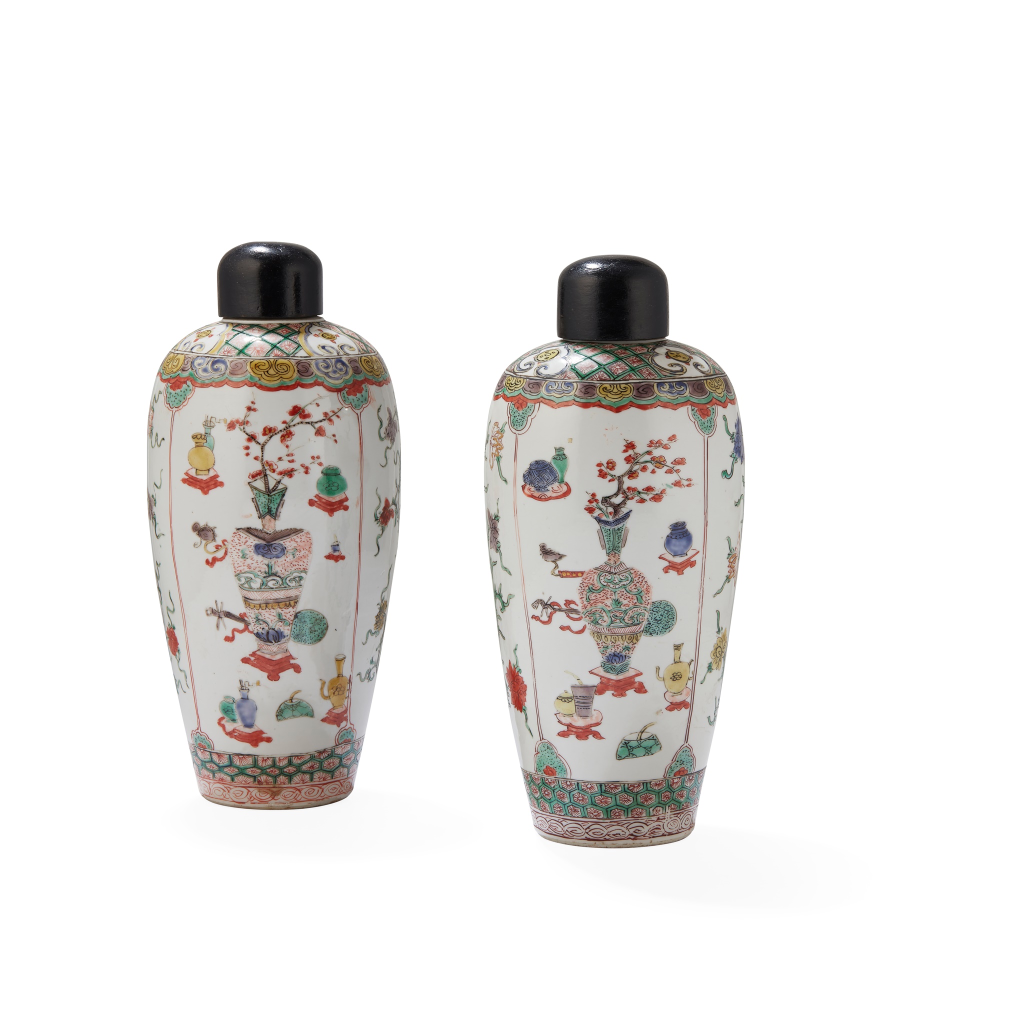each of oval shape with high shoulders extending to a narrow unglazed mouth, painted to the body with 'Bogu' and floral motifs in four cartouches against a floral decorated trellis ground, with later wooden lid