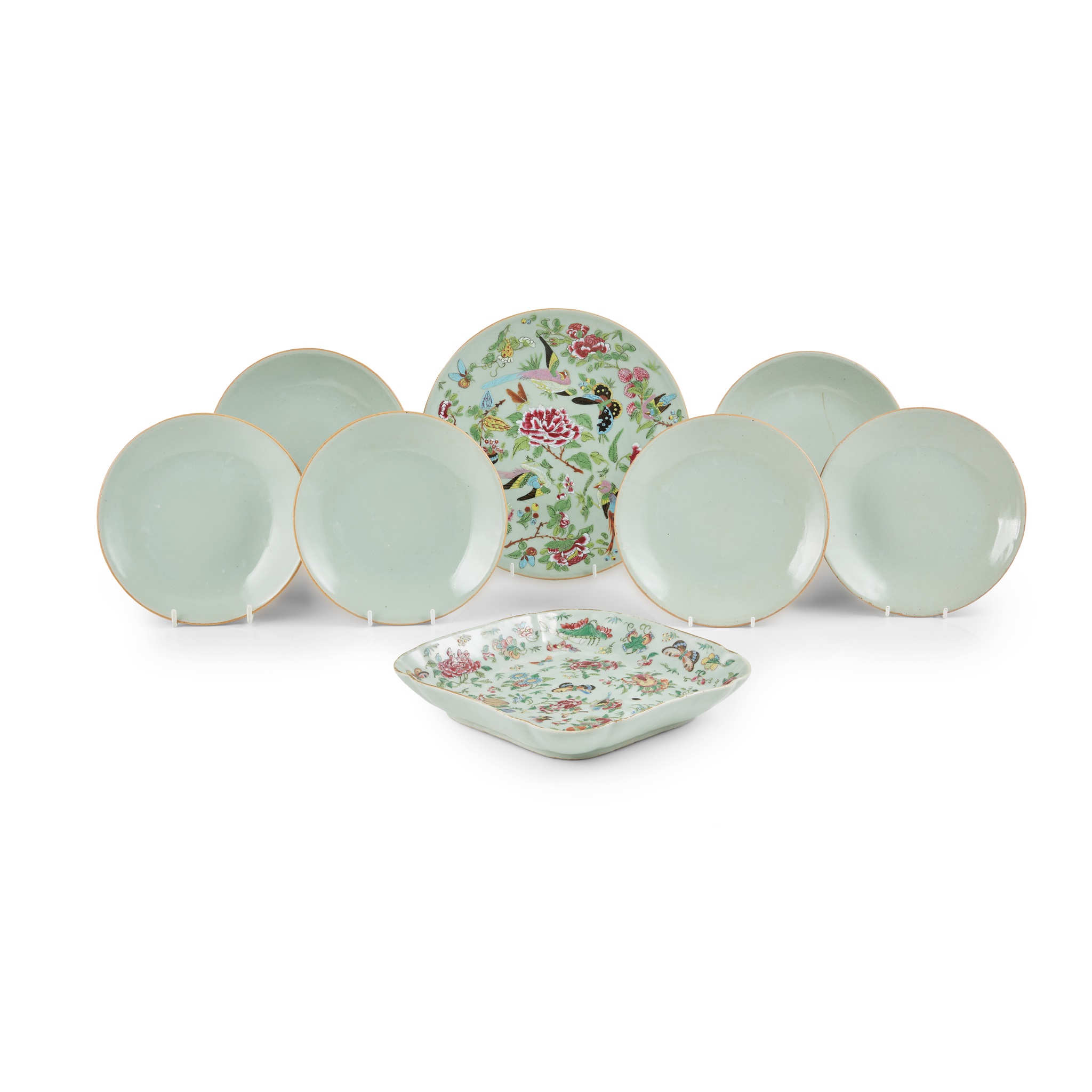 清末民初 豆青地廣彩花鳥紋盤(兩件)及豆青地碟(六件)(共八件)