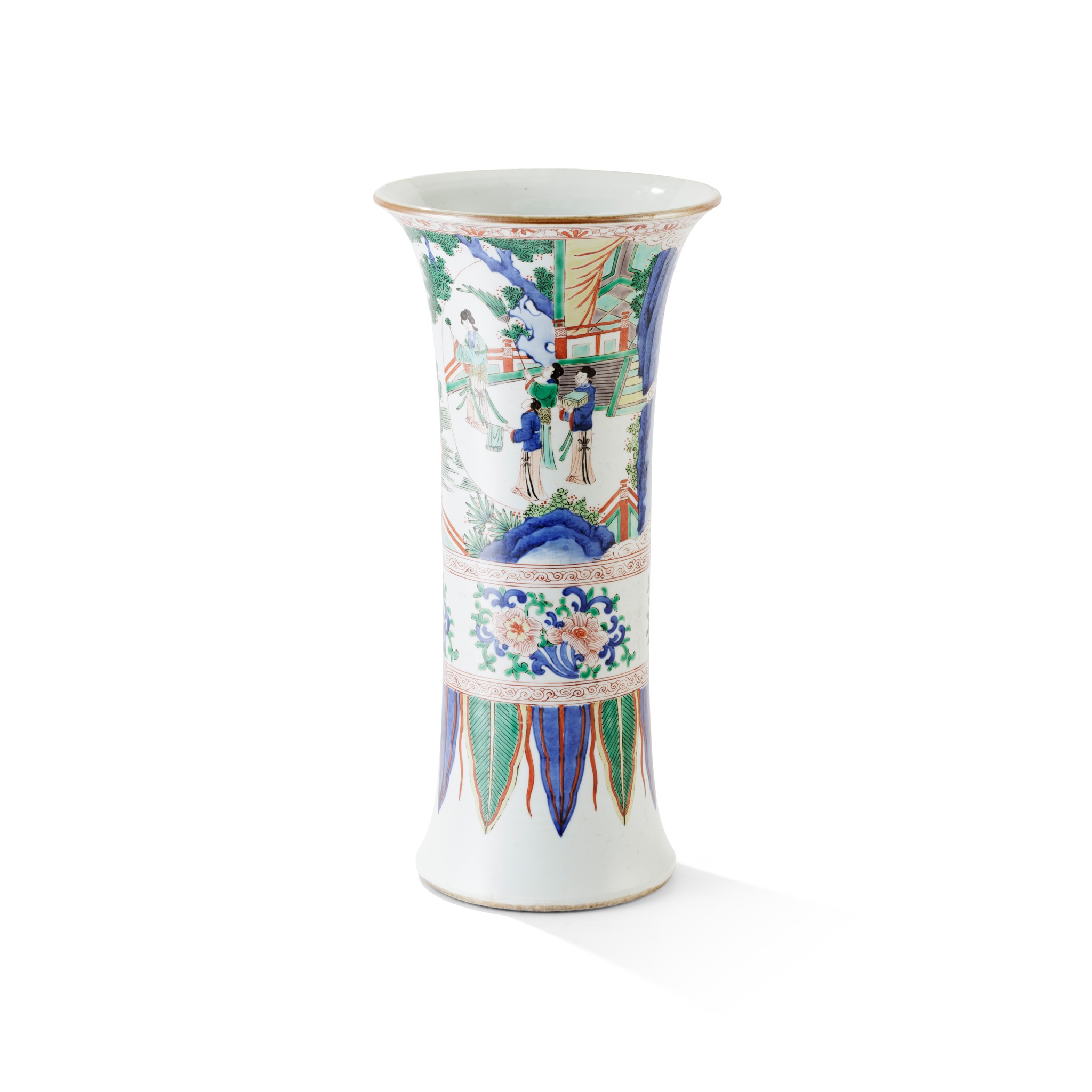 of gu form, painted on the upper section with figures courting at night, the lady accompanied by attendants, the male arrives on a cloud, the mid-section with a floral band, plantain leaves decorated with lower part