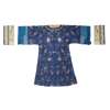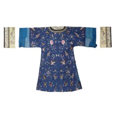 with wide quarter-sleeves, featuring on the dark-blue silk damask with floral pattern with embroidered butterflies and floral sprigs, with an ivory coloured border further embroidered, together with a detached pair of ivory-ground silk embroidered sleeve bands