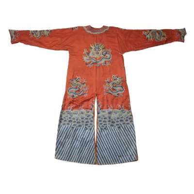 featuring on red coloured silk ground with embroidered blue four-clawed dragons above crashing waves on the lower hem