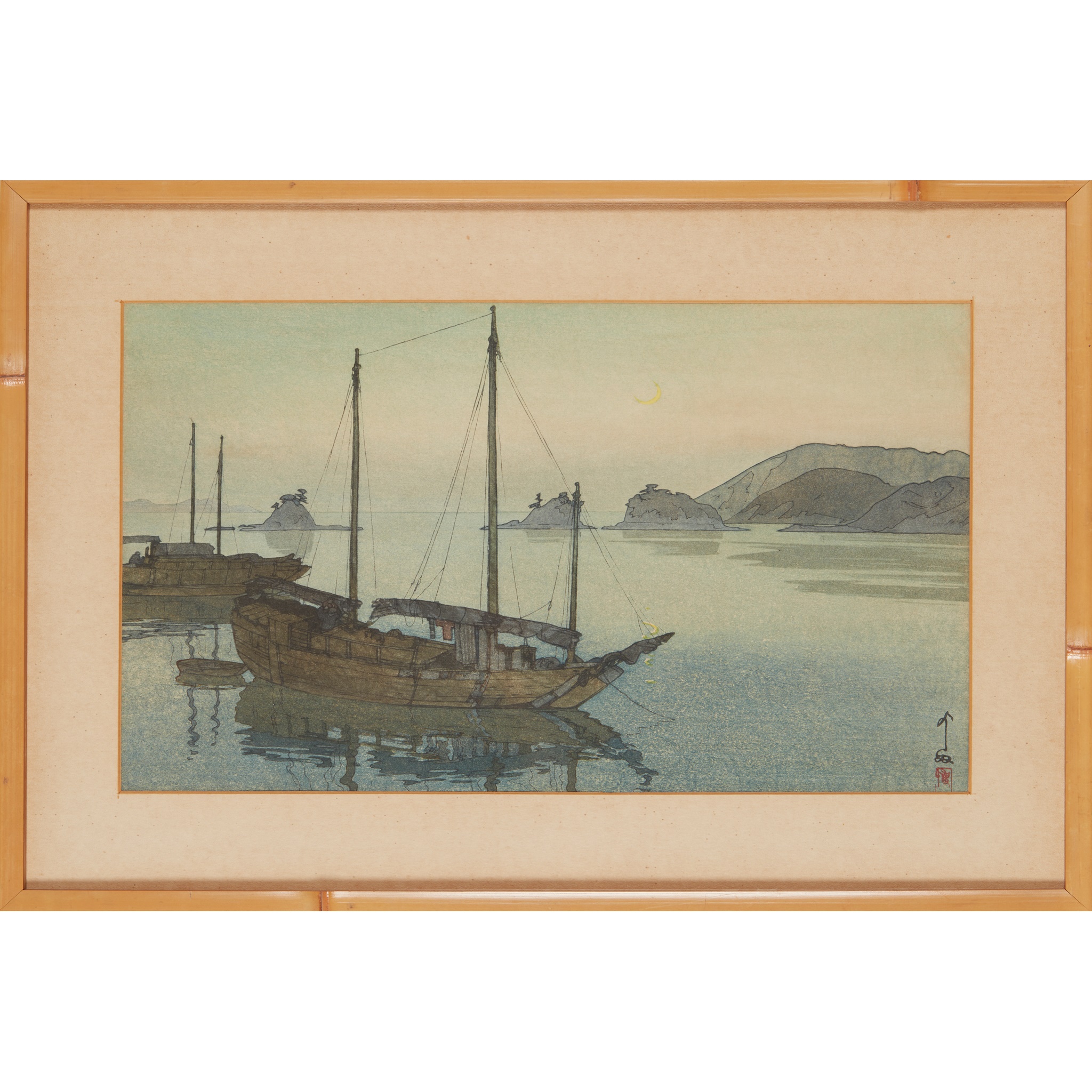 one 'The Inland Sea, Second Series: Three Little Islands' (Seto uchi kaishu dai ni: Mitsu kojima), signed Yoshida with artist's seal Hiroshi, left margin with Showa gonen saku (made in Showa 5 [1930]), followed by print title, Seto uchi kaishu dai ni: Mitsu Kojima, with English title on the bottom margin, ‘Three Little Island’, and signature in Roman script, ‘Hiroshi Yoshida’; the other depicting Toshogu Shrine, signed Yoshida with artist's seal Hiroshi, left margin with Showa juni nen saku (made in Showa 12 [1937]) followed by the title, with English title on the bottom margin in Roman script 'Toshogu Shrine' and signature in Roman script, ‘Hiroshi Yoshida’