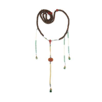 the court necklace comprising one hundred and eight agarwood beads spaced with carved translucent red beads, auxiliary tassels adorned with turquoise beads; and the rosary with similar quantity spaced with coral beads