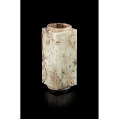 worked as a cylindrical tube within a square form, all sides left plain, the stone of creamy-grey colour with greenish tinge, distinctive black streaks especially on one side