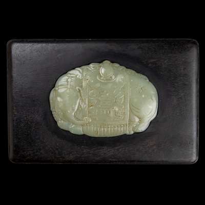 one white jade boulder carved with two deer on a rock in openwork, the other celadon jade boulder carved in high relief with three scholars walking in the mountain towards a large pine tree, each boulder with a fitted wooden stand; together with ONE RECTANGULAR WOODEN BOX WITH JADE PLAQUE INLAID ON THE COVER, the celadon jade plaque carved in low relief with an elephant carrying a vase on its back