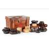 comprising: twenty-one circular; one oblong; one square; and two shaped carved wooden stands; together with five Japanese boxes and four hinged boxes; in a leather trunk