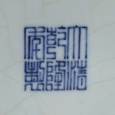 the globular body carved and moulded with four circular cartouches each with five bats intermitting by peaches encircling a shou character, reserved on ground decorated with cloud, the tall straight neck with plantain leaves, the base inscribed with a six-character Qianlong mark in underglaze blue
