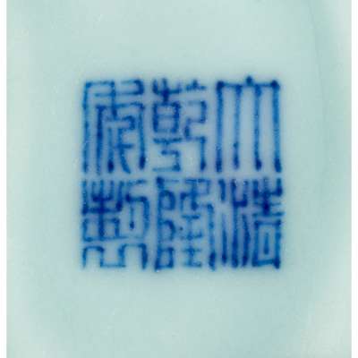 moulded as a naturalistic dried leaf, all edges delicately curled up, the back moulded with raised vines and front similar subtle silhouette, spreading across the base with nine small unglazed spur marks, otherwise, applied thoroughly with a luscious opaque glaze in blueish celadon tone, the base inscribed with a six-character Qianlong mark in underglaze blue