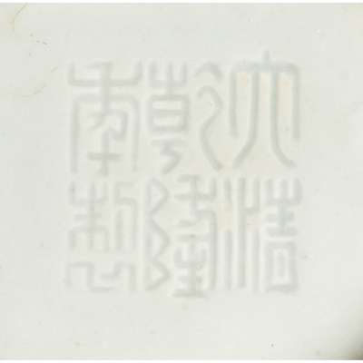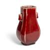 of four-sectioned form with canted corners, flanked by a pair of tubular ears, applied overall thinning on the edges with a burgundy-coloured glaze, the base engraved with a six-character Qianlong mark