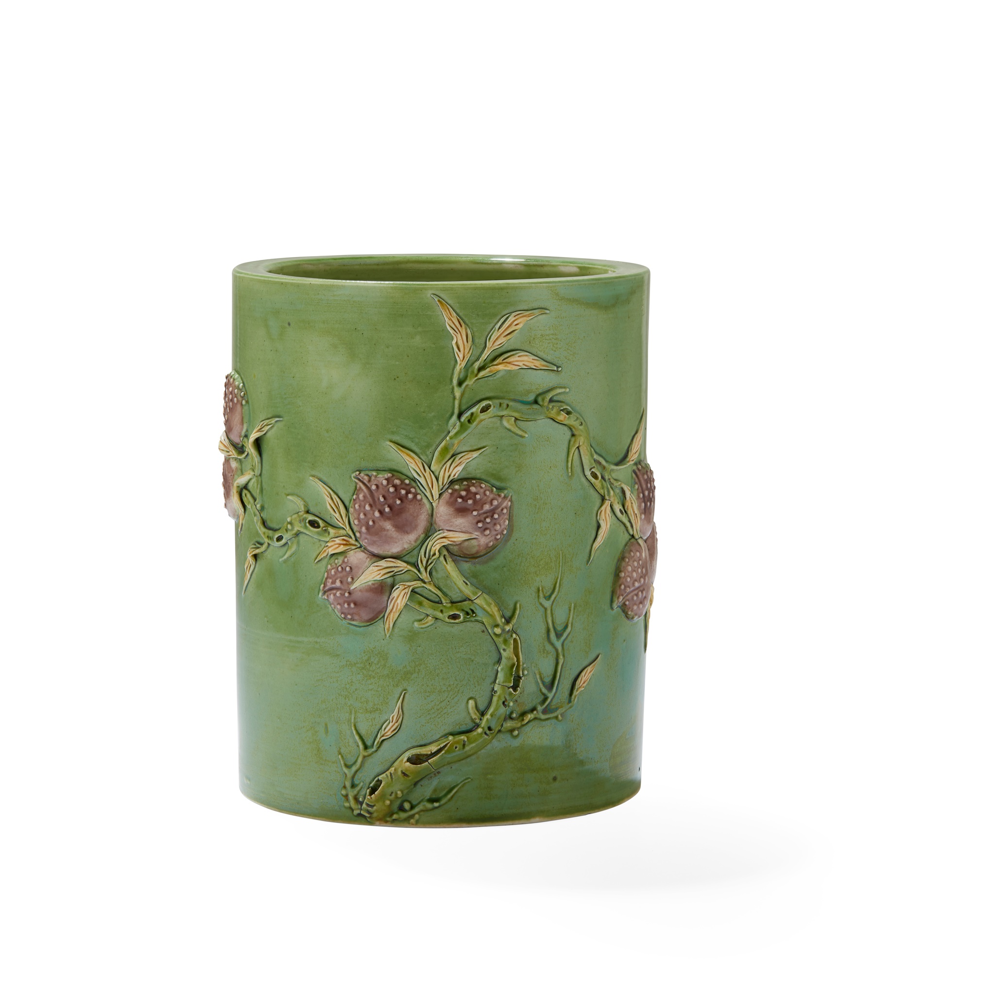 民國 素三彩綠地堆塑桃蝠紋筆筒