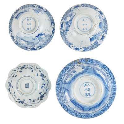 comprising: two plates; four petel-rimmed dishes, of which three in a set; two lids for teacups; and three bowls, largest with its base inscribed with a six-character Kangxi mark within double-circle, two smaller near pair with a six-character Xuande mark within double-circle