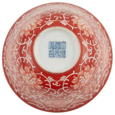 finely potted with deep rounded sides rising from a short straight foot, reserve painted in rich coral-red with blossoming lotus flower in tendrils, the interior glazed white, the base inscribed with a six-character Daoguang mark in underglaze blue
