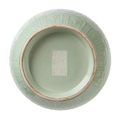 sturdily potted with a globular body, supported on a short splayed foot and topped with a flaring cylindrical neck, the body carved with various flower heads in tendrils, the shoulder further carved with a band of ruyi-head and scrolling flowers, the neck adorned with plantain leaves all below a band of swirling waves around the mouth, covered overall in a pale celadon glaze, the base carved with a six-character Tongzhi mark in a recessed rectangle in white glaze