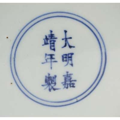 the bulbous body terminating into a short, inverted neck, the lower body painted with mythical sea creatures in swirling waves, the upper part decorated with tassels and flower heads, the base inscribed with a six-character Jiajing mark in double-circle