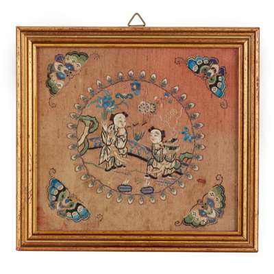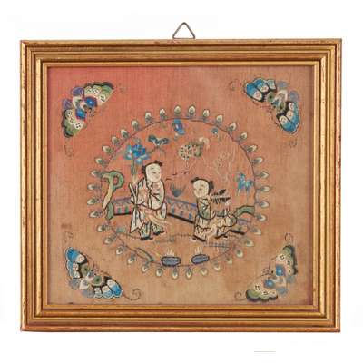 comprising: four pairs of sleeve bands in which two decorated with ladies in a garden, one with butterflies and flowers, and the other with birds and flowers; one square panel with bogu motif arranged with flowers; and a pair of panels each with Hehe Twins in the centre surrounded by four butterflies, against a red ground